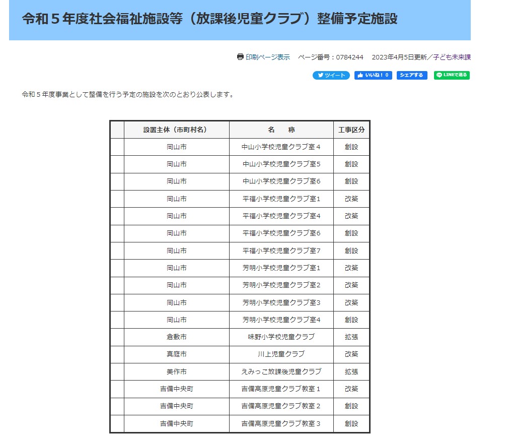 岡山県のホームページには令和5年度の社会福祉施設等(放課後児童クラブ)