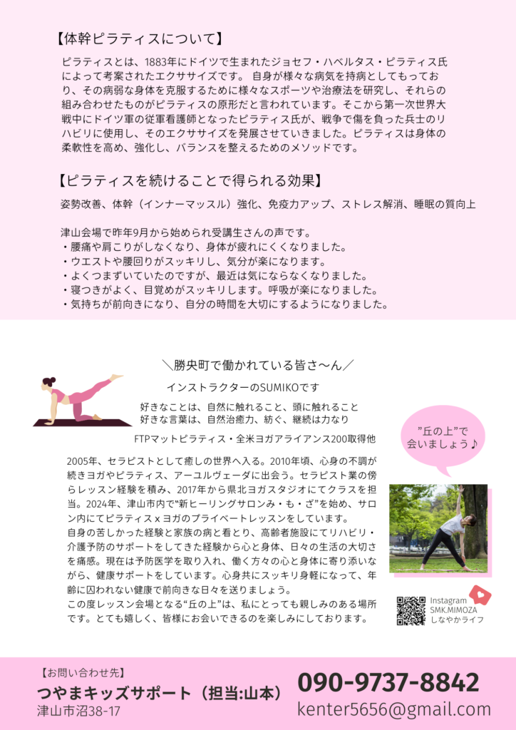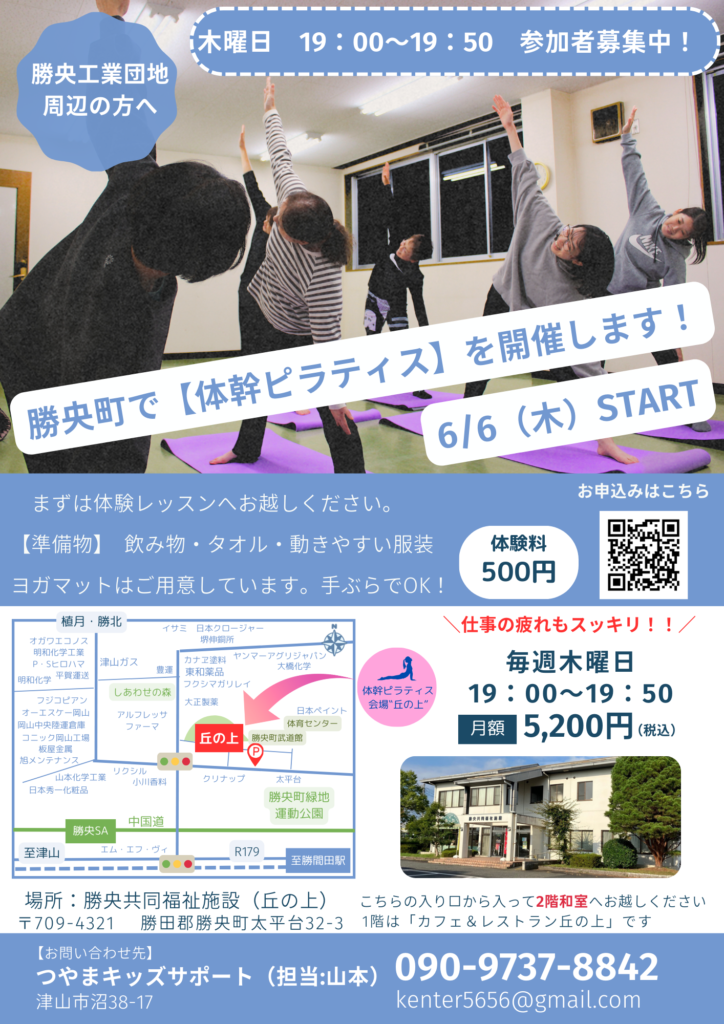 このたび勝央中核工業団地の勝央共同福祉施設の2Fで、ヨガの要素も取り入れたピラティスを6月から開始します!